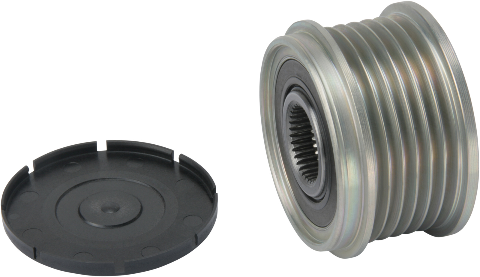 Afmeting 1 groef 9.80, Afstand achter in mm 4.30, Vrijloop: Met, Breedte 38.30, Boring diameter: 17.00, Groeven 6, Diepte 14.40, Draairichting Rechtsom, Snaar type: Multi Snaar, Schroefdraad M16-1.50, Buitendiameter 53.70, Poelie type Multi-V;Vrijloop